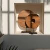 Deze prachtige teakhouten cirkeldisplay op zwart metalen standaard is een prachtig decoratief item. Dit stuk verdient absoluut een speciale plaats om je interieur, overdekt terras of tuin te verfraaien.