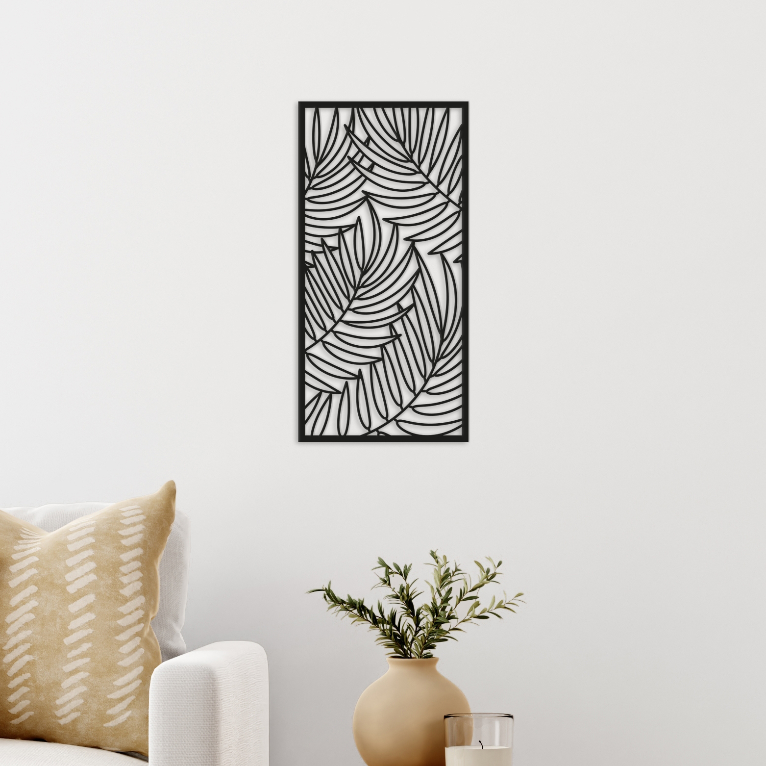 Dit stukje Nederlands design is gemaakt van zwart MDF. Het wordt geproduceerd met zeer moderne lasertechnologie, waardoor het mogelijk is zeer gedetailleerde ontwerpen zoals deze palmbladeren te maken.