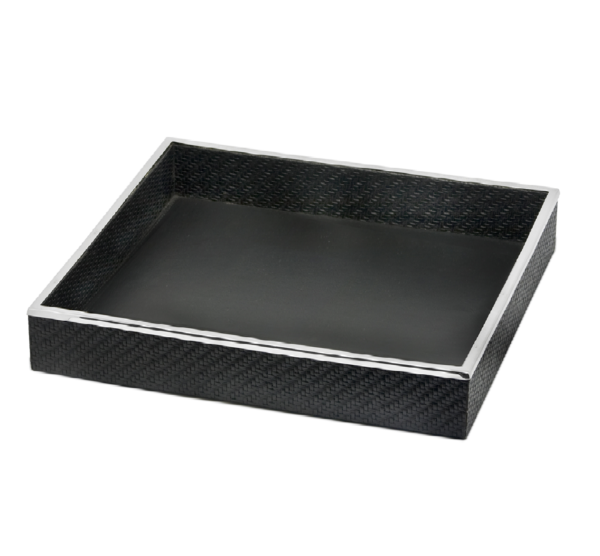 Dit handgemaakte dienblad, uitgevoerd in staal met kunstlederen omslag, kan gebruikt worden als ontbijtblad voor croissants en koffie, voor het ontvangen van klanten en gasten of als stijlvol decoratief element op tafel of console.