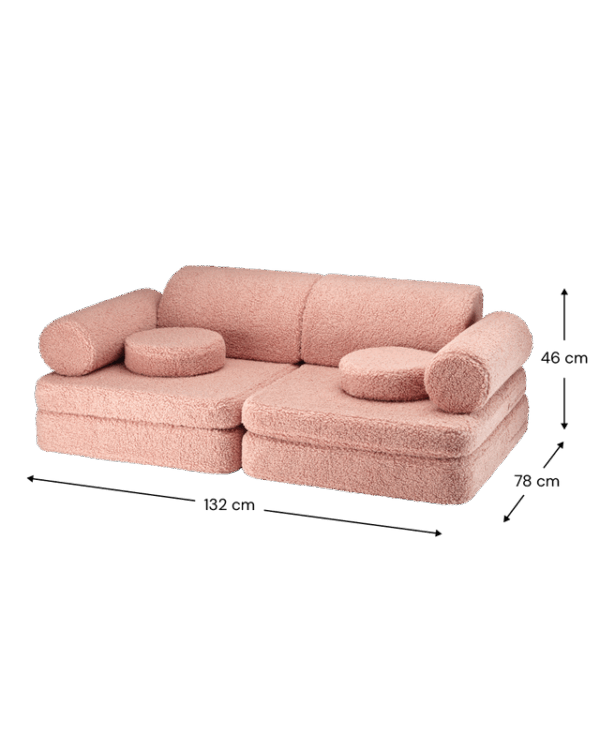 De bank wordt geleverd in 9 delen – twee zitkussens, één groot zitkussen, twee driehoekige kussens als rugleuning, twee rolkussens als armleuningen en twee ronde kussens. Dat maakt deze bank niet alleen comfortabel om op te zitten, maar hij kan ook worden omgetoverd tot een speelhuis, een fort of een bouwwerk, dankzij het unieke modulaire ontwerp. De mogelijkheden zijn werkelijk eindeloos!