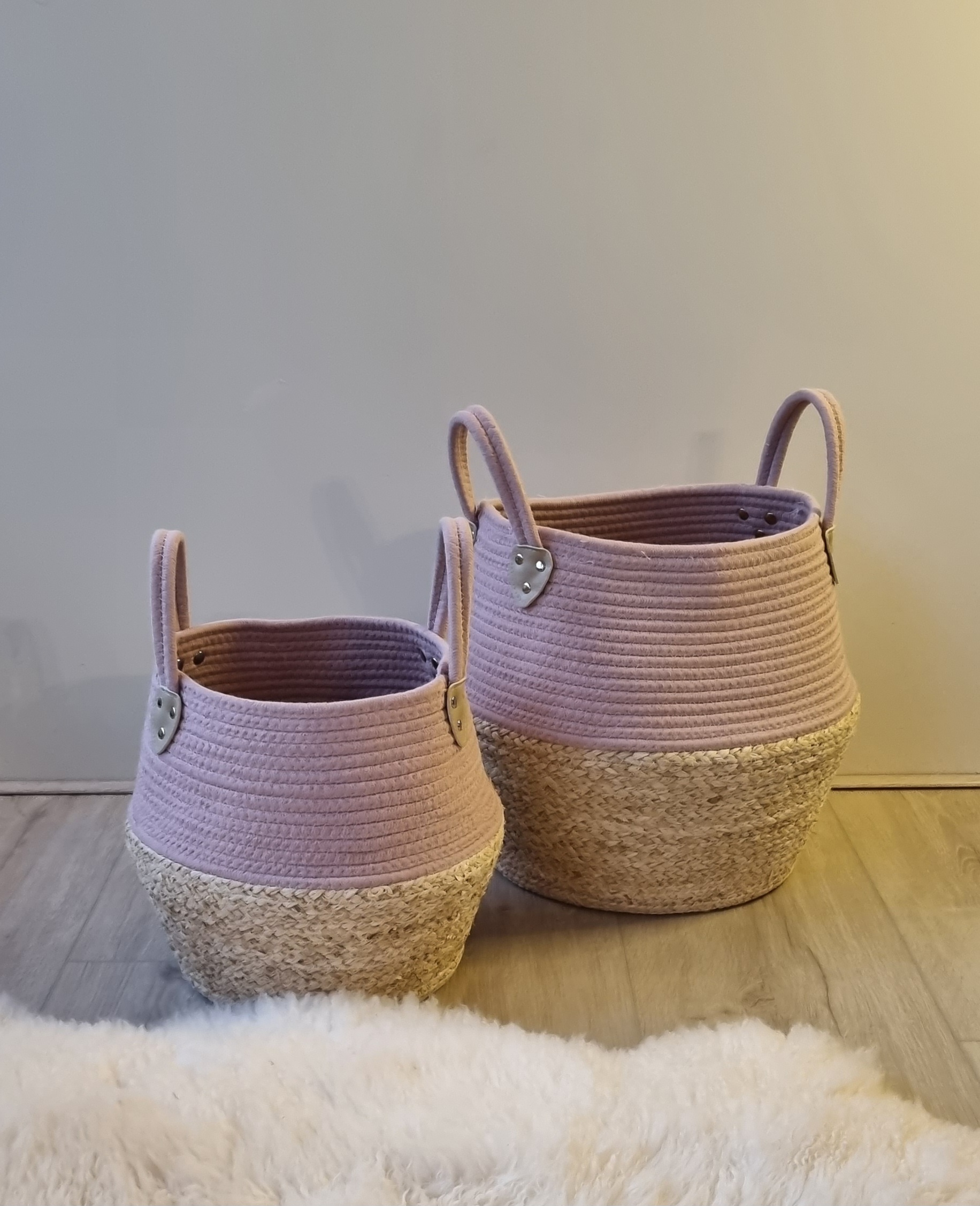 Het onderste deel is gemaakt van natuurlijk gevlochten materiaal in een warme naturel kleur, wat zorgt voor duurzaamheid en een rustieke uitstraling. Het bovenste deel is vervaardigd van stevig touw van katoen, waardoor de manden een interessante textuur krijgen.