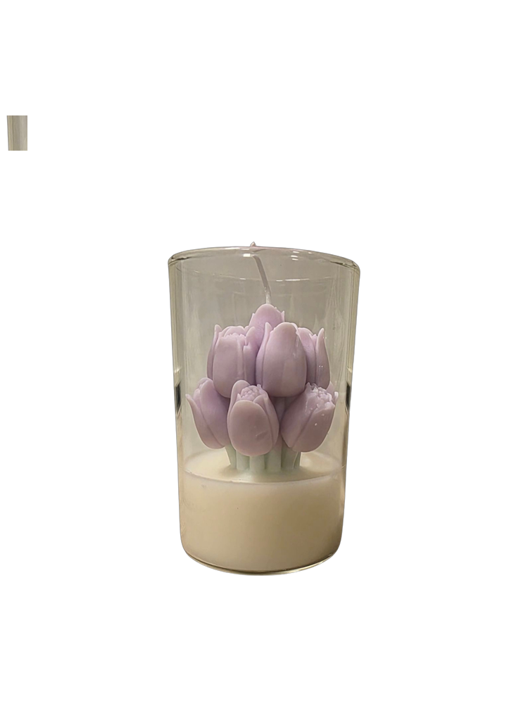 De kaars is vormgegeven als een bosje lila tulpen, wat zorgt voor een speelse en romantische uitstraling. Leuk om je eigen interieur mee op te fleuren of om cadeau te geven.