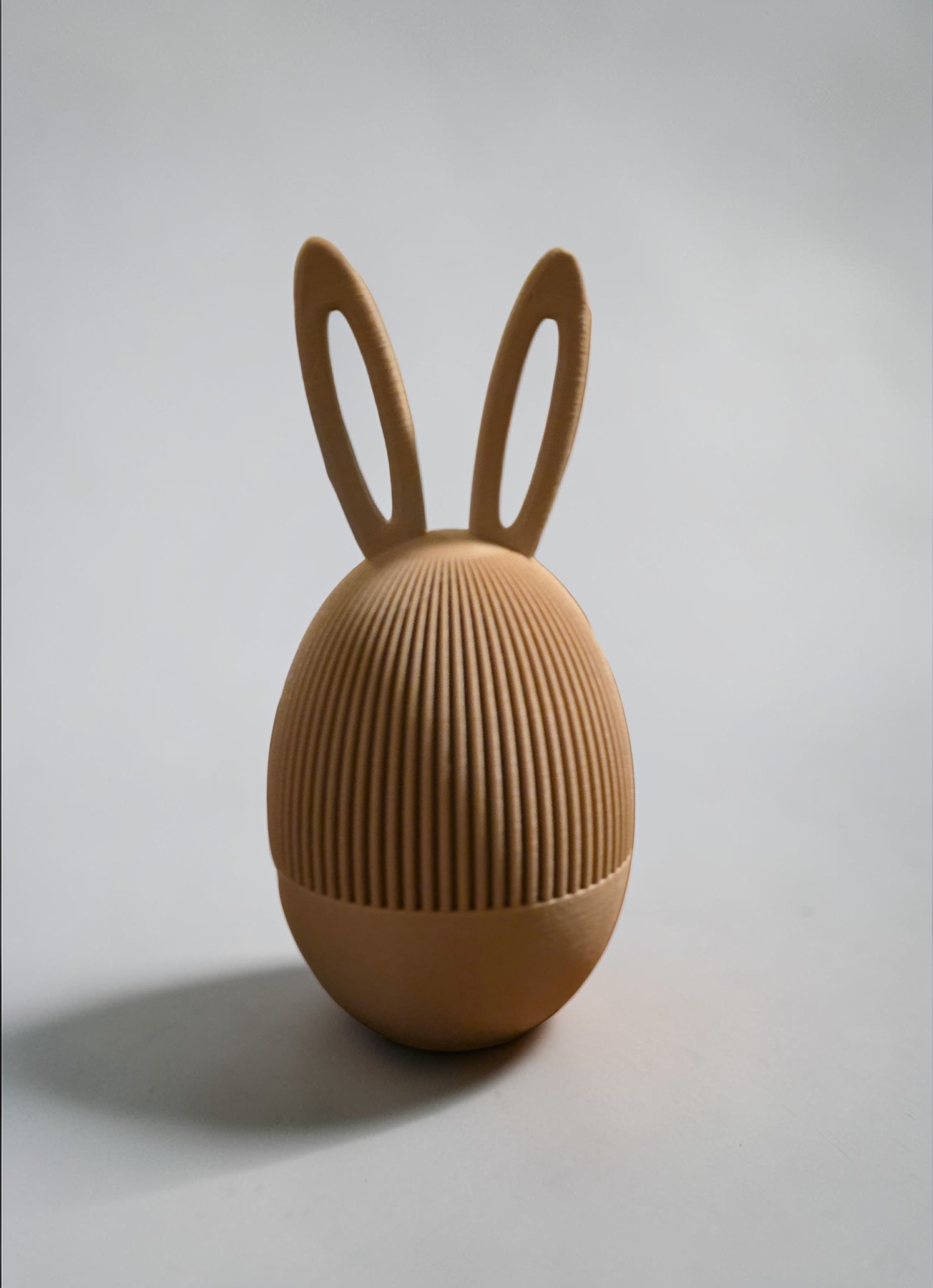 Dit 3D-geprinte paasei met konijnenoren is een speelse en stijlvolle toevoeging aan je paasdecoratie. Het ontwerp combineert zachte vormen met een subtiele ribbelstructuur, waardoor het ei een moderne en elegante uitstraling krijgt.
