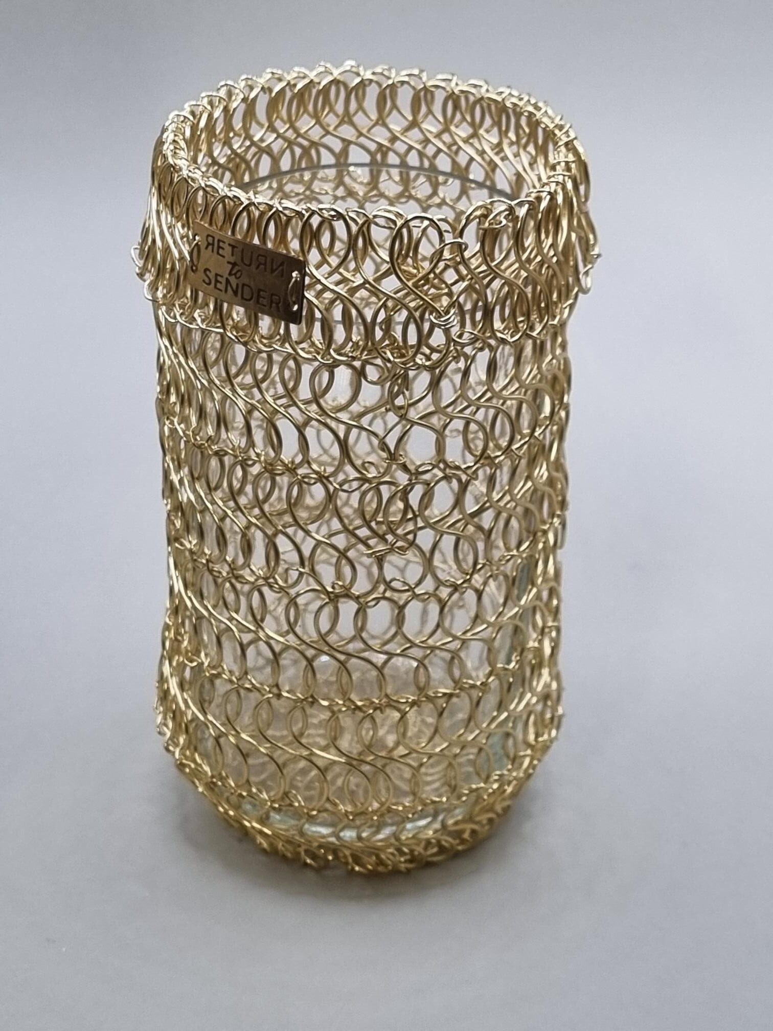 Dit theelicht van Return to Sender is handgemaakt in India, geweven van goudkleurig metaaldraad. Modern en gezellig in ieder interieur. Deze waxinelichthouder met glas aan de binnenzijde is mooi te combineren met het grote geweven metaaldraad theelicht.