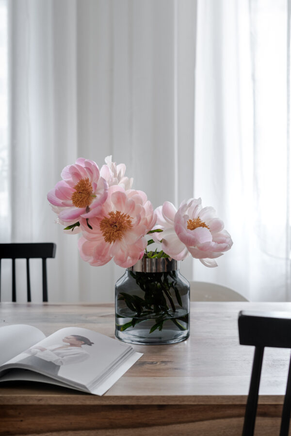 De mondgeblazen glazen vaas Gabi van Edzard vindt zijn perfectie in de glanzende zilveren platinarand en presenteert zo allerlei soorten bloemen op een stijlvolle manier. De vaas is geschikt voor elk formaat boeket.