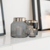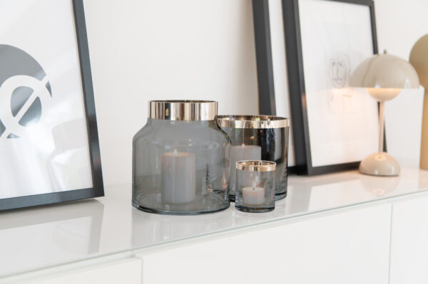 De Gabi-vaas is gemaakt van hoogwaardig en robuust kristalglas (rookglas), afgerond met een opgedampte platinarand, waardoor het een absoluut interieur-it-piece is. Deze kan ook als windlicht worden gebruikt.