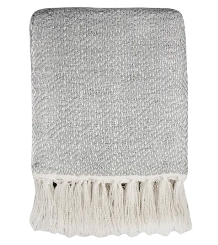 Kleed je huis aan met deze prachtige plaid van 150 x 125 cm. Hij heeft een grijs diamantontwerp en de rand is afgezet met franjes met kwastjes.